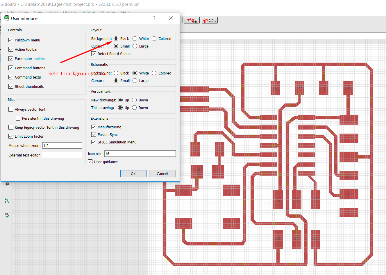 Once done, in order to continue with the milling we need to export the PCB file to an image. If we do not change the background color and select only monochromatic the PCB will be like: