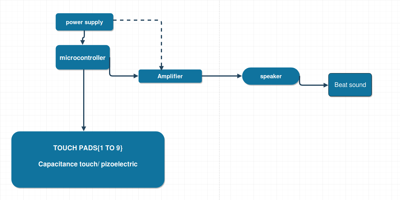 My idea is to make a box like thing with plywood and it have 3rows and 3 columns in each columns are with capacitive sensor and fillind with perticular beat sound when we touch to each of these shells The beat will comes out through the speaker