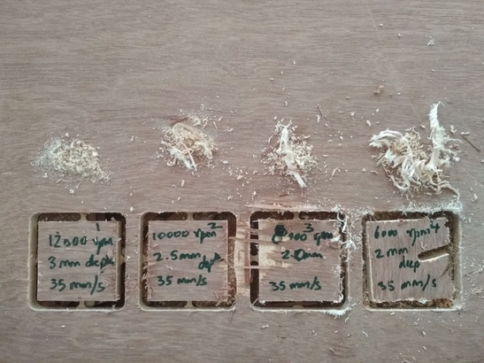 .and it gives the tolerance as "29.8mm" that means it gave a tight fit in that slot. Test for spindle speed,runout,toolpath,Alignment, Speeds and Feeds of SHOPBOT For testing this we cut small square shapes at varying spindle speed,feed rate and depth.