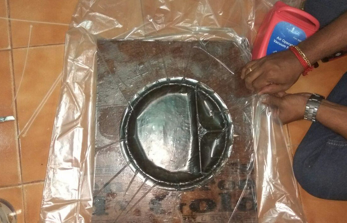 After completing the composite making, I made a vacuum bag and place the mold in that, use a vacuum pump to create the vacuum inside that. It helped to make the cotton and resign tight to mold. After that, I seal the material put below some weight.