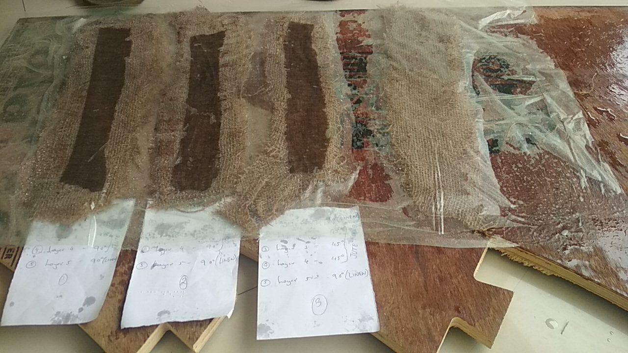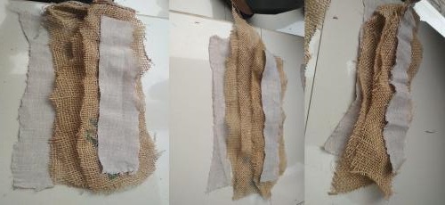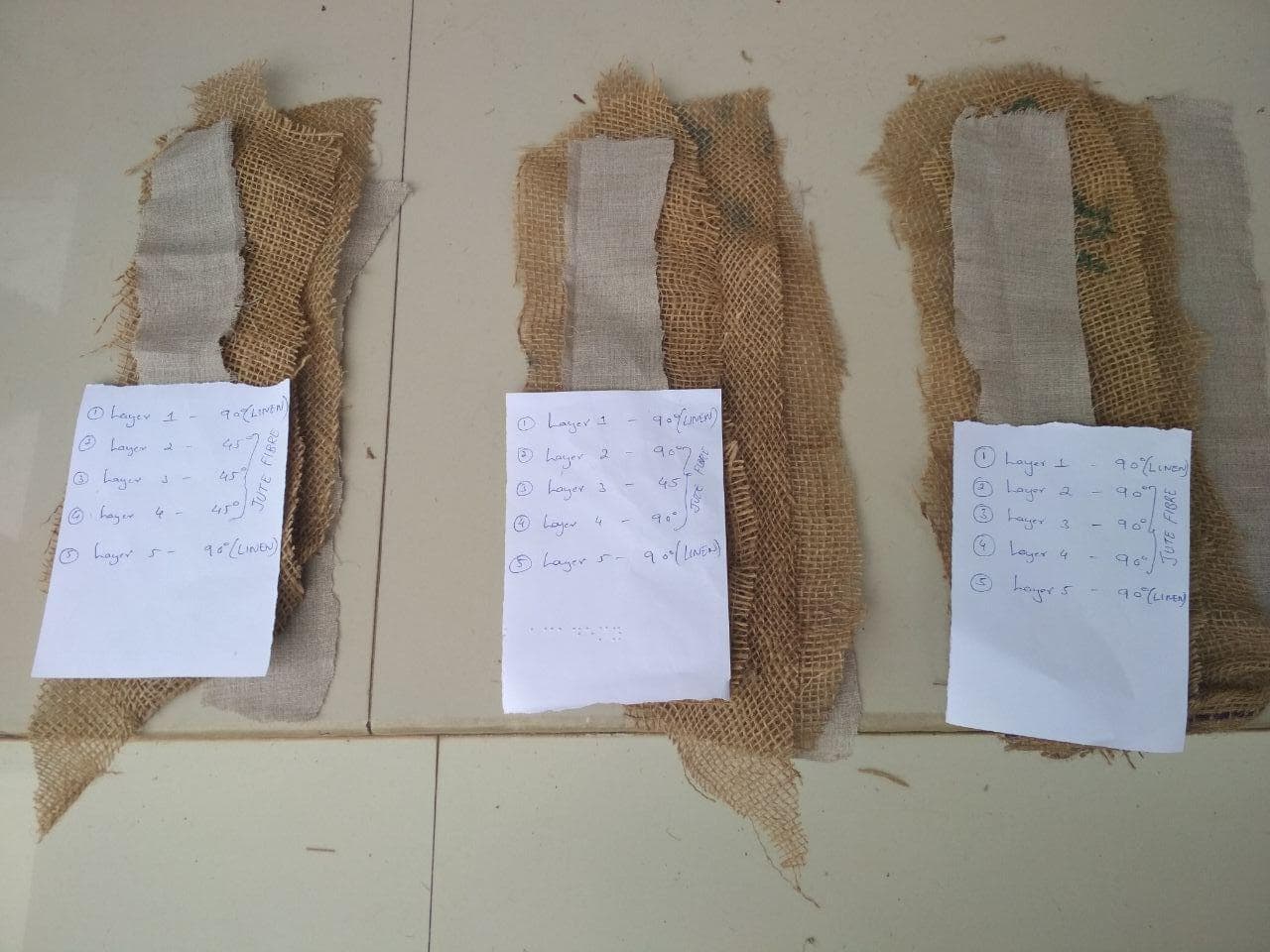 First test piece in which two layers of linen is arranged at 90 degrees and three layers of burlap is arranged 45 degrees. Second pieces Two layers of Linen having an angle 90 degree and the middle layer of burlap having 45 degree and other two layers with 90 degrees. The third consists of Two layers of Linen having an angle of 90 degrees and three layers of Jute having 90 degrees. Here in all test processes which linen is placed top and bottom and burlap is on the middle