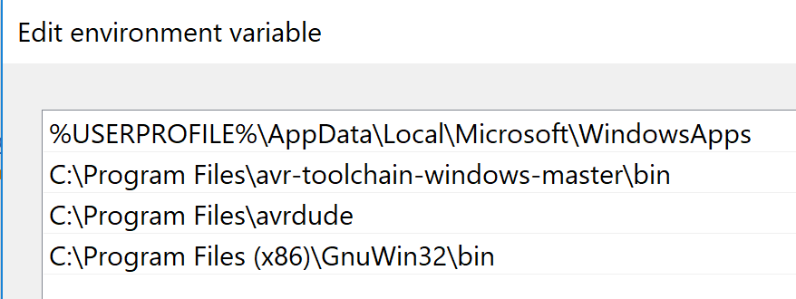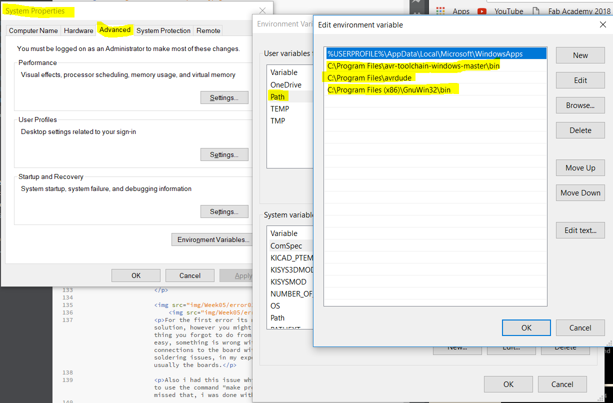 First you need three things downloaded, Atmel Gnu toolchain, GNU make and AVRdude. Then you have to set the advanced system settings Environment variables. You open that window and then choose Path and then edit, which will show you that window necessary to add the three paths. Then you need to install Zadig software, the driver for windows and the fabisp firmware. Zadig was used to install a driver to the USBTiny, more info if you go to their website. The firmware was used to program the board to be an ISP but we had to edit a file as the instruction says. We did this because, the make is different for the avrisp2, so anything else will use the usbtiny make, so adding a # before the avrisp2 line will comment it and ignore it when making, so removing the # before the usbtiny line will activate that line and not ignore it. I also should note you need to connect your ISP board to another ISP board, but that other board should be already programmed in order for your board to be programmed. So we program a FabISP board with another FabISP board. the following connection should be made before you do the make commands below.