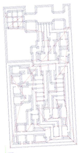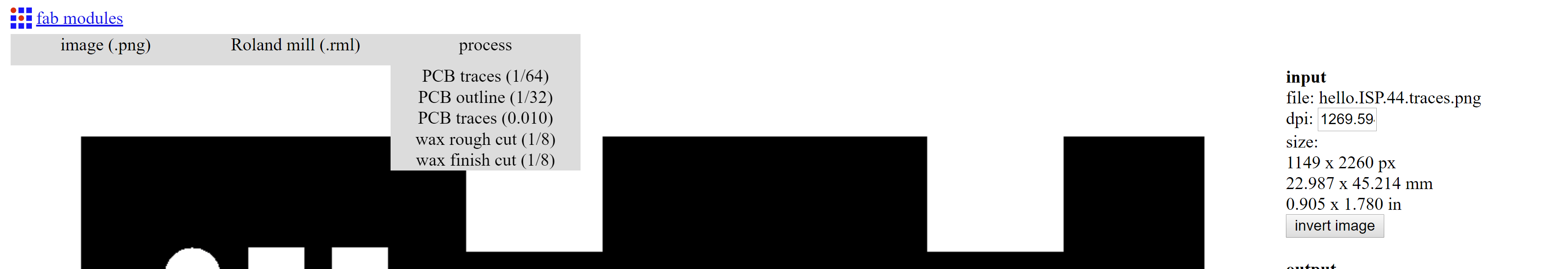 first step is to use fabmodules.org to produce the right format file(rml) from the designs above, you simply find your png designs and upload them, then you choose which file format you want to get, which in our case the roland mill (rml) format, you then need to choose what process you want, so for the traces pick traces and so on and lastly you choose the model of the roland CNC, which in my case was the SRM-20, then you need to choose your process is it traces or outline cutting. After that you need to choose your machine and set the values of x,y and z to 0. You will notice that other values change once you do that, lastly you press calculate and you get the following. Changing the bits is very easy, just handle them with care and remember that each one is used for a different job, for this board i used 2 different bits, the 1/64th one which was used for tracing and the 1/32Tooth(Just ask Wendy[Hyperlink her]) one, it was used for the interior the final cut of the board.