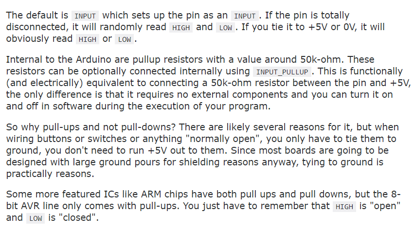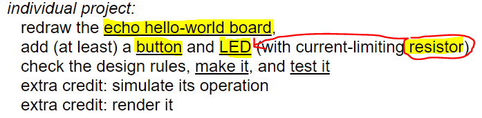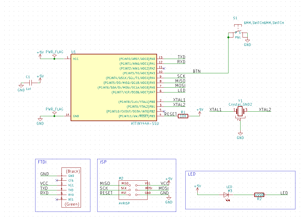It was a lot similar and some things actually required more clicks, but KiCad had issues, like sometimes it doesn't show you everything on design because the software was either lagging or glitching, Eagle was just better. 3-Extra CreditI did program the board using the arduino example "Button" and this was the result. I wasn't clicking on the button i was just touching components. This was because i didnt use "INPUT_PULLUP" in the arduino code to activate the internal pullup resistor in the attiny on the button pin, a neat explination i found in this link here. It explains really well i can't compete! And now it works! 5-ProblemsHonestly doing the traces manually is a problem, at this point no one told us we could do the traces automatically, later i found out we could, but even then the software wasn't perfect. When the traces were impossible to calculate, the software didn't add jumper spaces on its own, but it did create holes to connect jumpers under the board, i guess that is something. Anyway what i ended up doing later on using Eagle, is using that auto route option and whenever i get 80% completed traces or something, i just add jumpers manually and continue the work on the left 20% of traces. Another problem i had was that my ISP Programmer suddenly wasn't recognized by my laptop, after a while of having multiple attempts on trying to fix it, resoldering it fixed it and i am proud!