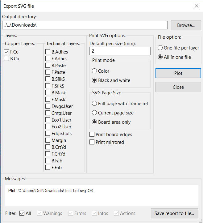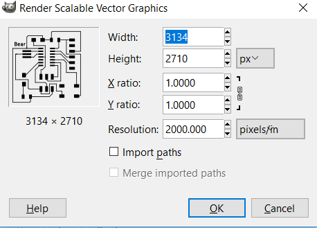 The text window is simple, you just type your text and confirm, then you pick where to place it. Perform Design Rules Check: This is just like the ERC but it is made for the Board Design view, it even has the same icon. In the window, you just click Start DRC and check what problems you might get and try to fix them. See i do have some unconnected pins, but that is irrelevant i don't need to connect them based on that component datasheet. This is what you need to know to get started with tracing your boards. Next is to export it to a PNG, in KiCAD you can't do that, but you can however export it to an SVG, and that is what we did. Make sure you check off the Technical Layers and Check the F.Cu because we are using only the front, we want it in black and white and then plot it. We opened the SVG file on Gimp software and made sure the dpi is set high 2000 is high. We used Gimp software here because it allows SVG to PNG Export and that is what we wanted, just make sure you put the compression to 0. Next step is to go through fabmodules with the follwing PNGs, I did document the process in Week05 So refer to that.