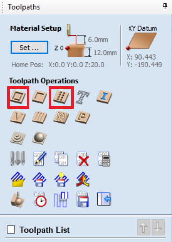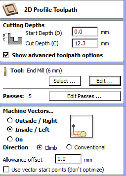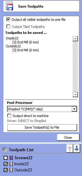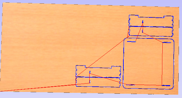 Red4: The spindle speed is the speed of the tool turning, our lab already tested 12000 RPM and it was great on the plywood i was gonna cut, so i kept the setting. This is it, you can now click on the calculate button after you give it a name to tell it apart. -Profile ToolpathAs you remember, our plywood thickness is 12mm, i chose 12.3mm cutting depth, why did i go over? well that is because we want to make sure it goes all the way and cuts it, we are not afraid anything breaks because we do have another plywood sheet under it, so it will just etch the below surface and will give us a clean cut hopefully :D. Again click the calculate button and give it a meaningful name to tell it apart. Then we select the outside traces, and do the same process steps except Outside instead. For the outside, you need to add tabs, tabs are basically tiny places where the milling bit will not cut while going along the cutting path, this is to ensure the piece doesn't move when cutting. The length of the tab, is like the width of it, how wide you want it to be, i chose 9mm because my pieces are big and i want that much support from tabs to hold my piece, you also need to choose the thickness, i chose 3mm because i want to easily be able to cut it using a Chisel tool. This will automatically create tabs on i would say random locations, but they aren't really random, you choose the number of tabs per piece, i chose 8 here, then i clicked add tabs. this is what it looks like. Each square with a 'T' letter is a tab, I prefer not to have tabs on where pieces connect together, this is because i don't want to sand them off later, so i move tabs manually by dragging them with the mouse button. Note you can only drag tabs in the edit mode. This is a great example of where i prefer my tabs to be, not on corners i dislike corners. Then you are ready to calculate. You can preview the how the actual pieces will look like if you click on the preview toolpath icon and the 3d view tab above. This will show you this window. A good thing to check when previewing, is that your inside cuts are done first, it is a best practice to do that. to check which is gonna be cut first, you need to slow down the speed from the scroll bar above, then click preview all toolpaths. You will see something similar to below, but really slowly shaping if you noticed it did the outside before the inside that means you need to move the inside toolpath calculation up in the toolpath list. Then that is it, you need to create the shopbot file now. Clicking on the above icon will show this window. We always make sure to untick the "Output direct to machine" button, just to make sure that we did set the xyz zeros correctly and to double check some other things. Press Save toolpaths to file and you will get the shopbot file. -AdditionalYou can check how much time will the cut take by clicking on this icon. Then you will reach this window. I dont need to explain this it is obvious, each toolpath calculation with it's time estimate. Note that this below is the actual shopbot table vcarve file, i only did calculate the top of it as it takes time and i didn't have much left, i just wanted to make sure everything was okay, anyway the below one has all parts they are just not that organized. Download the VCarve file here. 3-ShopBotAll i have to do now is to use the shopbot!