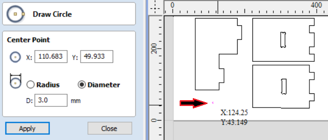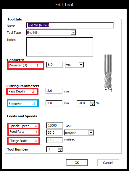 We just want to mark the plywood with few millimeters deep holes, that will help us screwing the plywood too. The tool has 6mm diameter, if you choose 3mm as the circle diameter, it doesn't matter because the tool will drill 6mm anyway, i feel it is better if i used 6mm instead, but i already worked on this. As you see the arrow, the you just move the mouse on the position you like and create the circle by clicking the left mouse button, you will get the 3mm circle in that position. At this stage we are ready to start calculating the tool paths. There is a Toolpaths window on the right. We mostly used these 2 for cutting using the shopbot, the marked left icon is called "Profile Toolpath" the other is "Drilling Toolpath" let's start with the drilling first. We need to make sure that we are just marking the screw positions on the plywood, so a cut depth of 3mm is just fine. Then we need to choose our milling tool, to do that we select it from a database already created, or if the tool you are using is not there you just add it from this window below. When you create/edit a milling tool you get this window. Above numbers are actually what i used for the 6mm end mill bit. Red1: This is the diameter of the milling bit.