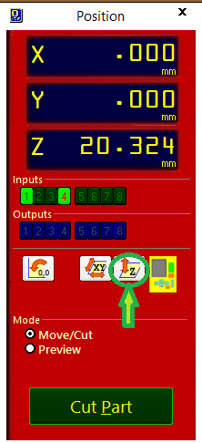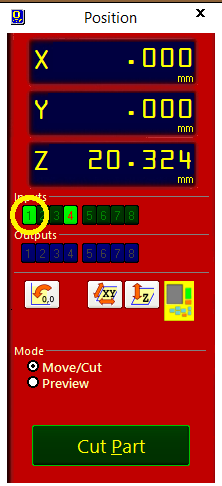 We use the yellow panel to the right to make sure the shopbot is indeed connected and we try to move it. Great, now we need to reset the xyz and origin them to 0. Let's start with xy, first we go to bottom left corner this is when you are facing the switch. We manually find the tip of that corner and double check that it is indeed fine then origin.