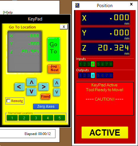 Great now we can begin zeroing by clicking this here. Done, now we can start the cut! First let's do the screw marks. You click cut and find your screws shopbot file, which by the way should not be with the inside/outside toolpaths, it should be separate because we need to stop after marking the screws. Click start. you will get this notification because the cut depth is 12.3 while the material thickness is 12, we just click ok because i explained above, then we press the start button and wait till the bit reaches max speed and then click ok.