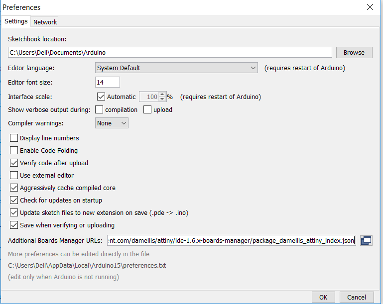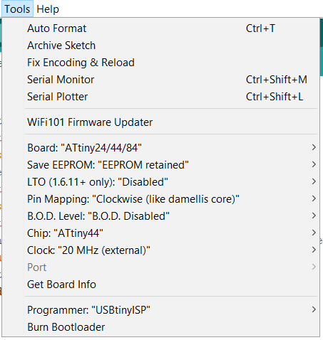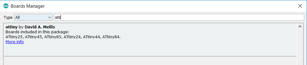My ISP wasn't working, i thought maybe i would try another usb port, i didn't think it was getting anything else from it except for power. i was wrong, but nothing happened. The correct way is to actually use 2 usb ports from ths same laptop. Attiny LibraryYou can find attiny libraries on the internet, I was already introduced to this library here, by hashim in a session he made for us, then there was this other library that wendy found here, which is more detailed. The way to install the boards library is as follows. You paste the link into the long textbox "Additional Boards Manager URLs". Then you go to Sketch, boards, board manager and search for attiny, and install this.