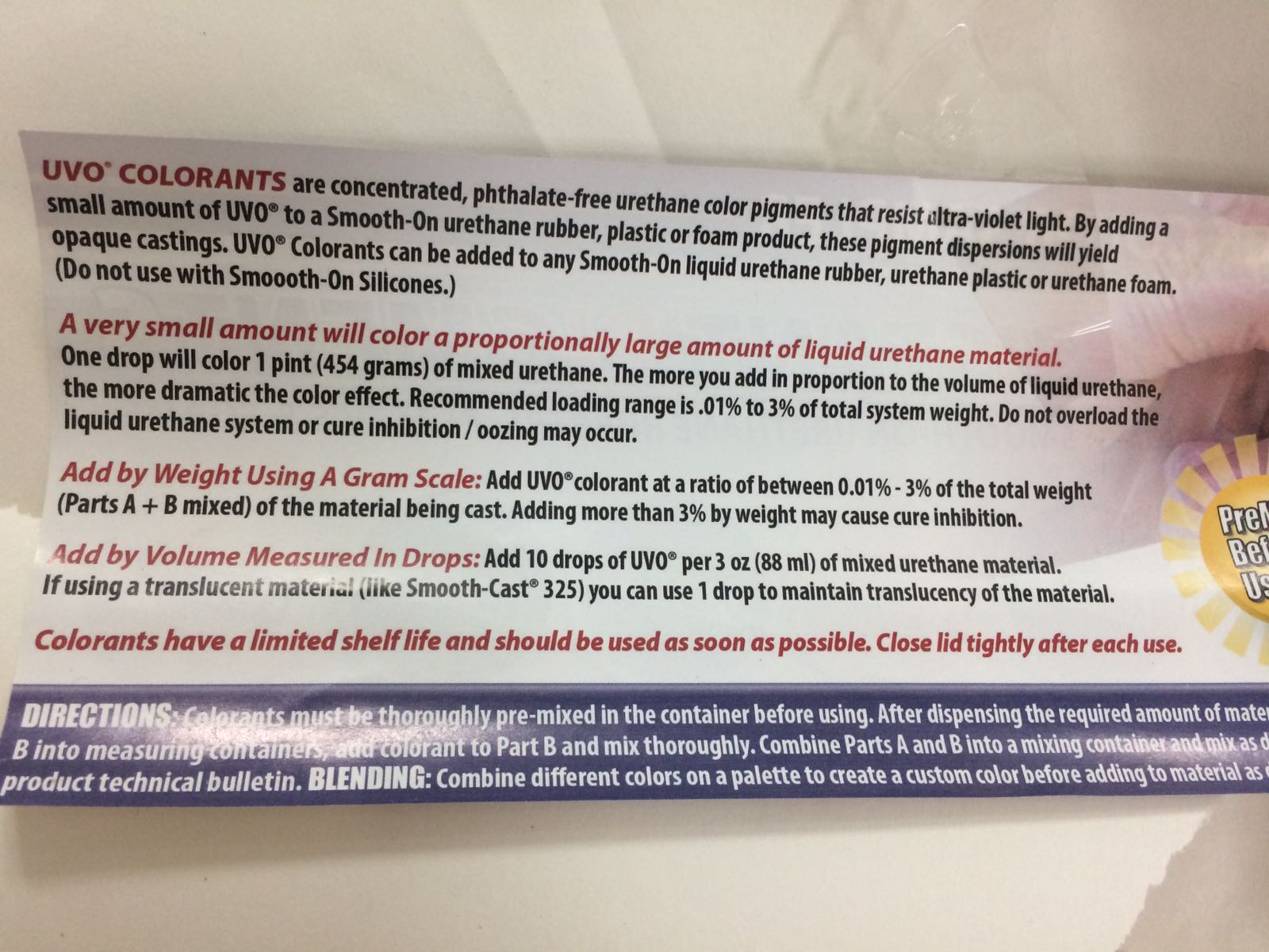 Above is the instructions for the colorant of the cast, it says the ratio should be between 0.01% to 3% of the total weight. The cast is Smooth cast liquid plastic 327.