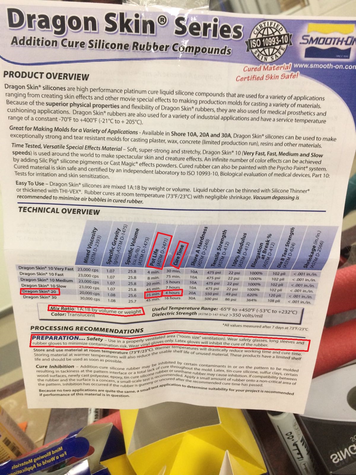 Zoom to see better, but basically mix ration is 1:1 by weight, pot life is 25minutes, this is how much time you have from mixing them together to pouring, you have to do it within this time or it will be too late as the thickness will be too great. cure time is 4hours, safety gear, note vinyl gloves and not latex! I poured the mixture by weight, Part A 45 Grams, Part B 45 Grams, mixed them together, and poured them into a thin line to reduce bubbles.