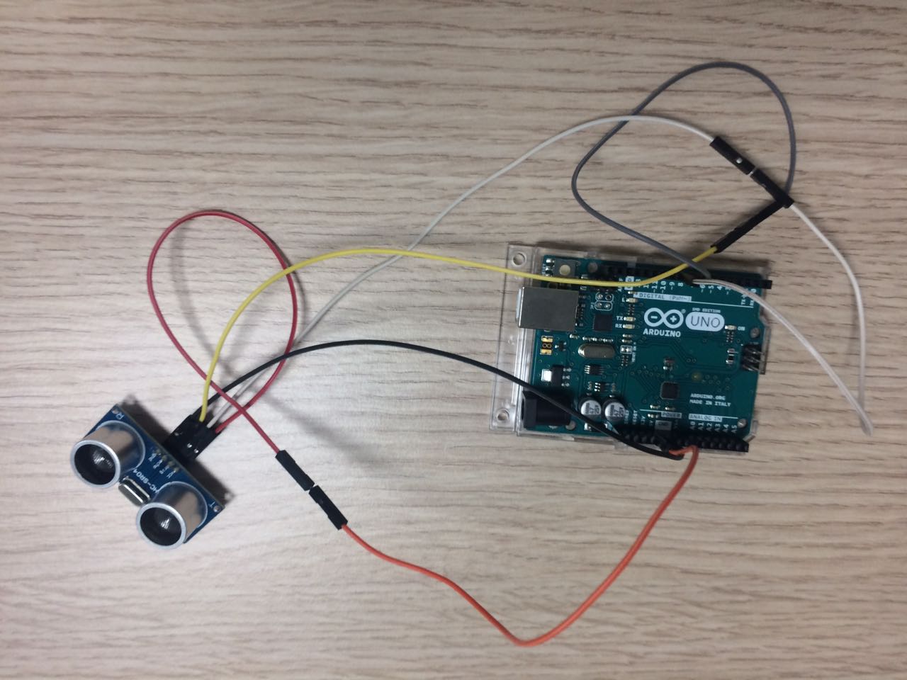 This sensor uses ultrasonic waves, meaning waves with higher frequencies than our human hearing ability limit. Eidha Al Rashdi actually discovered that you can hear it with your phone mic. WARNING LOUD NOISE!Ultrasonic can be used in Imaging, sonography and few other uses. I will use the most basic use, distance calculation. The ultrasonic actually transmit these high frequency waves which reflect on surfaces and to the sensor again, the sensor measures the time it took for the wave to transmit and then come back to the sensor, a mathematical formula transforms the time into a distance measurement. The sensor datasheet explains how the sensor operates, Trig is an input pin, so you can write to it, the Echo is an output pin, so you can read the output from that pin. I actually understood that more clearly after i followed the arduino code in this tutorial, the code comments explain better than the datasheet in my opinion. Download Ino file here. I had to see how the ultrasonic works before i make anything, so i used an arduino and connected it to the ultrasonic.