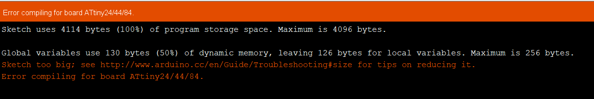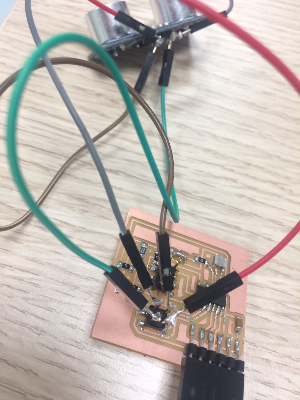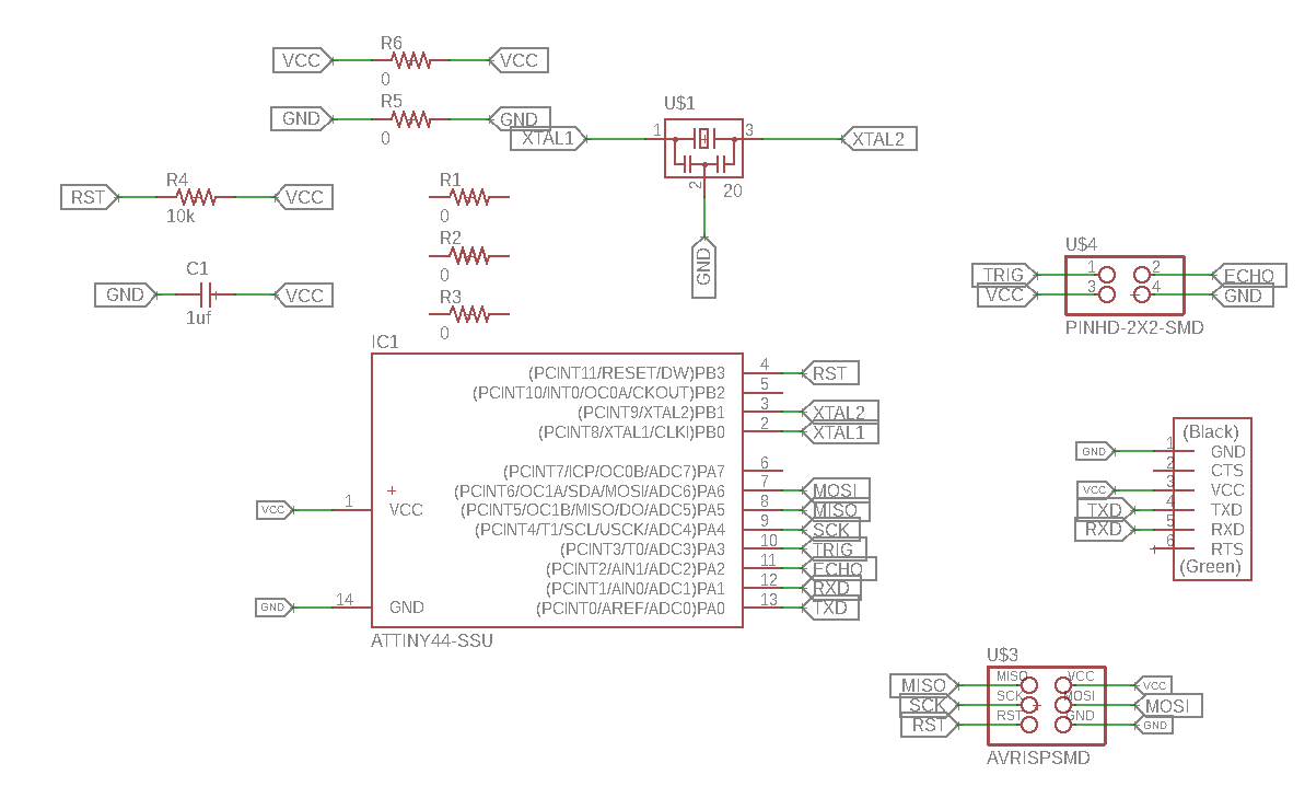 3-Programming boardI had the code already from the earlier tutorial. I saw the attiny datasheet and choose 2 pins as my echo and trigger pins for the schematics, and again to set up the pins in the arduino code. When i tried uploading i got a blank screen on the serial monitor. It took me hours to finally find out i forgot to burn the bootloader. I burned the bootloader to the board and uploaded the code. connected the sensor to the board and opened the serial monitor. Sketch uses 4114 bytes of 4096, So close yet so far... I wasn't gonna create another board or switch the attiny44, which i should've done now that i think about it. i just wanted to see if it would work. so i deleted some lines in code. It was a fun process deleting lines of code and looking at how much difference that would make. I learned that having a float or double value on your code, can alone take upto 700 bytes. I believe my attiny wasn't damaged, the code would take that much storage space anyway, so I will try another attempt later with another board, because i need it for my final project, So check the project development page on Week20. Alright so i deleted the float number in the code, so that means no more correct distance numbers, but i would be able to see something right? Wrong.. After Exausting most solutions on the same board, i saw something by touching the connections, apprently they were bad connections?! I tried soldering the connections and this is the result.