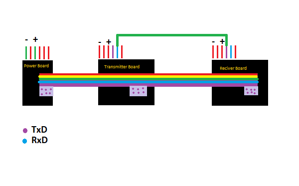 There is a wire from the RXD FTDI pin from the transmitter and to the TXD FTDI pin on the reciver, this is flipped because in the arduino code i flipped the parameters when decalring the software serial (Rx,Tx) i used (0,1) it should be (1,0) because if you see the schematics below. I am only using 2 pins on the power board, Vcc and GND. Flipping back the numbers will fix it, then you will need to flip the wiring back to the correct standard of connections, there is no right and wrong here, just good and better practice. Below is a video of the working communication, notice how the transmitter on top has slow blinking at first and the reciever is in a constant state. As soon as you click and hold for a bit the Transmitter LED becomes constant and the Reciver blinks fast. Download the Transmitter arduino code here. 3 boards NetworkI can actually use the ISP headers as pins to connect another board and i think logically speaking i dont need to use the wire from the FTDI pins RXD and TXD, i can just assign MISO pin as TXD and SCK as RXD, and change the pin numbers of the softwareserial rxd,txd to the appropriate pins of MISO and SCK, this way i can use as many boards as it is physically possible for the circut to handle, surely there is a limit. In this demonstration below i used the MISO pin as RXD and MOSI as TXD.