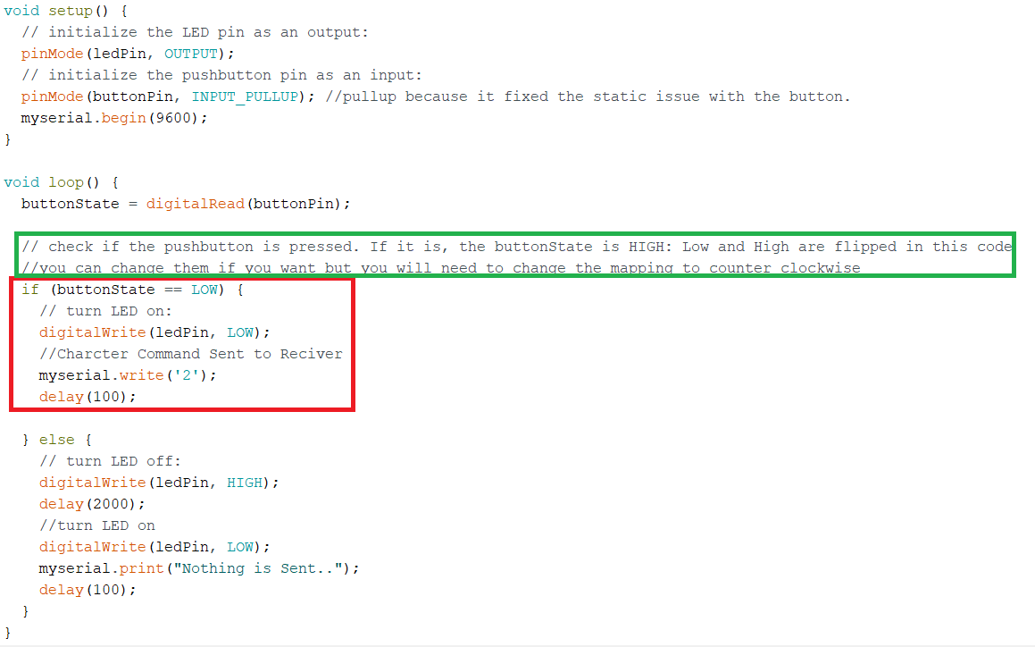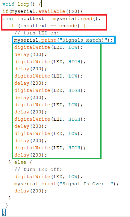 That is basically all you need for the easiest serial bus communication. Arduino CodeThis is divided into 2 parts, reciever and a transmitter. TransmitterI included a softwareserial library and namaed it myserial, i needed the softwareserial because i am making a serial bus, as you can see, if the button is pressed, the Red box code will work. In the Red box is an if statement that checks if the button is pressed, and as soon as it is pressed, it writes to the serial the charcter '2'. Delays are only added so that it doesnt spam too fast. Also in Green i wrote an explination of how to flip back the LOW and HIGH. ReciverIn Red a Char variable called inputtext is given the value of the serial read through the FTDI on the board. the Blue is a debug print for me, i used this to know exactly when was the momeny the board calculated the match. Green has a blinking routine i programmed when it recives the right signal. Testing Communication