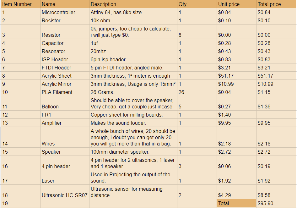 What will it do?It will show a visual presentation of sound vibrations using a laser. A cymatics Laser project.Who's done what beforehand?I found some with similar concepts Eunice lee, Darshan Shah, Montserrat Ciges. None however did it using laser projection in the fab community, accourding to my search results. Although i did find these three youtube links, link1, link2, link3. I had the idea from link1 and link2.What will you design?I just need to design a base that holds everything together in place. I want to make it more dynamic as in it should be easily adjustable like a chair, height and angle of laser pointer, possibly the angle of the rubber plate which holds the speaker under it too. So i am looking for something like the sketch above.What materials and components will be used?Laser, Speaker, Rubber sheet, board, 3d printed material, powersource, 2 ultrasonic sensors, mirror piece. Where will come from? most materials are from the lab, only few things missing, rubber sheet, mirror piece and speakers.How much will they cost?Speaker = 20 AED That was an early rough estimate, the new more percise estimate is below. What parts and systems will be made?I will design the 3d part(Includes Threads,board,wires), Possibly laser cut the mirror piece, board.What processes will be used?3D printing, Laser Cutting, CNC Machine,Vinyl Cutter,Programming, Designing Board.What questions need to be answered?I need to know how the delay affects the shapes on the wall, will some frequencies be visible because of the amplifier? Is it possible to hard code shapes by playing around with the speaker frequencies, can i project a triangle for example?How will it be evaluated?The 3D base, will take a lot of effort to make, the board design and programming, so these should be considered, along with the actual output of the device, is it really showing you something, how easy is the interaction, how do you feel about this application. What is the Schedule?I am gonna answer this by something quite similar to a gantt chart, i feel its much more representing and accurate than going into details.