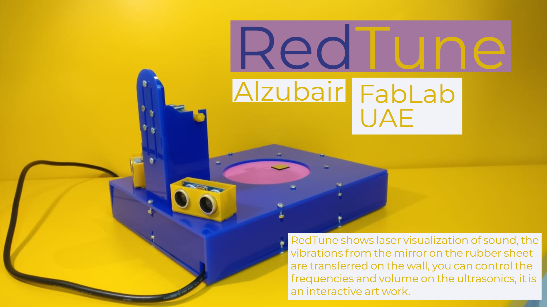 RedTuneThis project is a visualizing kit, an art piece or maybe even a kit to experiment with laser visualization of sound, my first intention was to use it to experiment production of shapes by the laser projection on the wall, there wasnt enough time for that, so i simply made a visualizing project of the laser, you change the frequencies by one ultrasonic sensor, the other should've controled the Volume(This failed) so instead i added frequency pulsing on the other ultrasonic. Slide