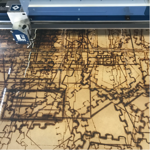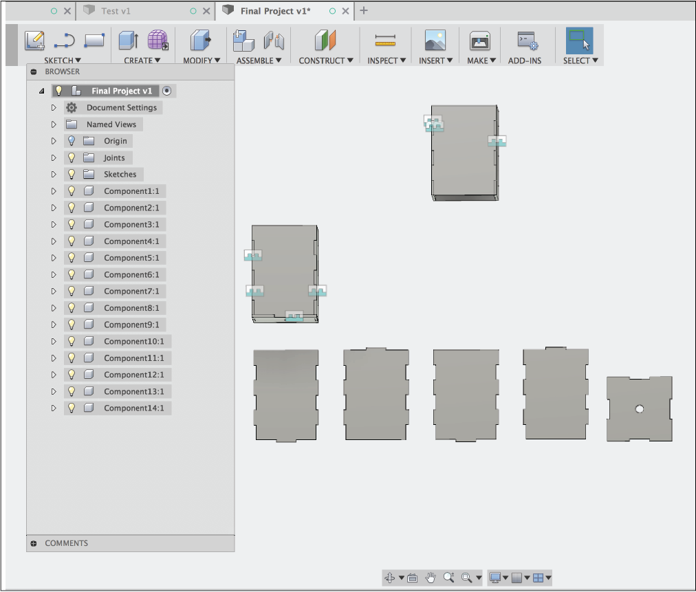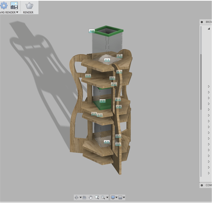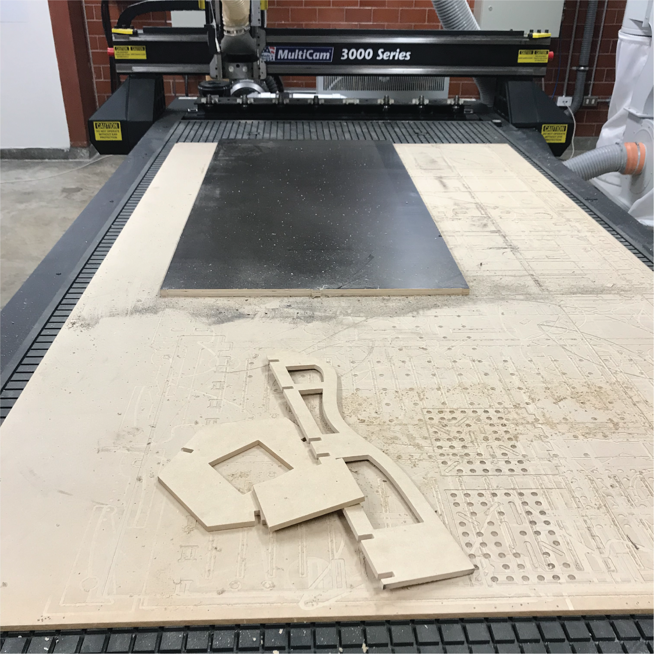 I proceeded to 2D milling the tower using a Multicam Machine. I worked with 9 mm -thick MDF, just as I did during "computer controlled machining". I assembled to check the joints and see how the machine would look like in the end. I used the enrouter software to do the CAM processing: