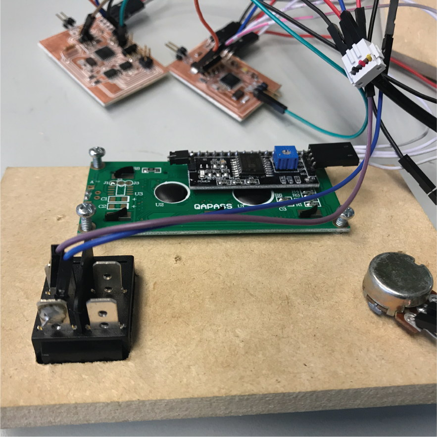 The second one is my "user interface" board. It receives the data from the temperature sensor and from the potentiometer and displays it on a 2x16 LCD screen.