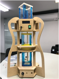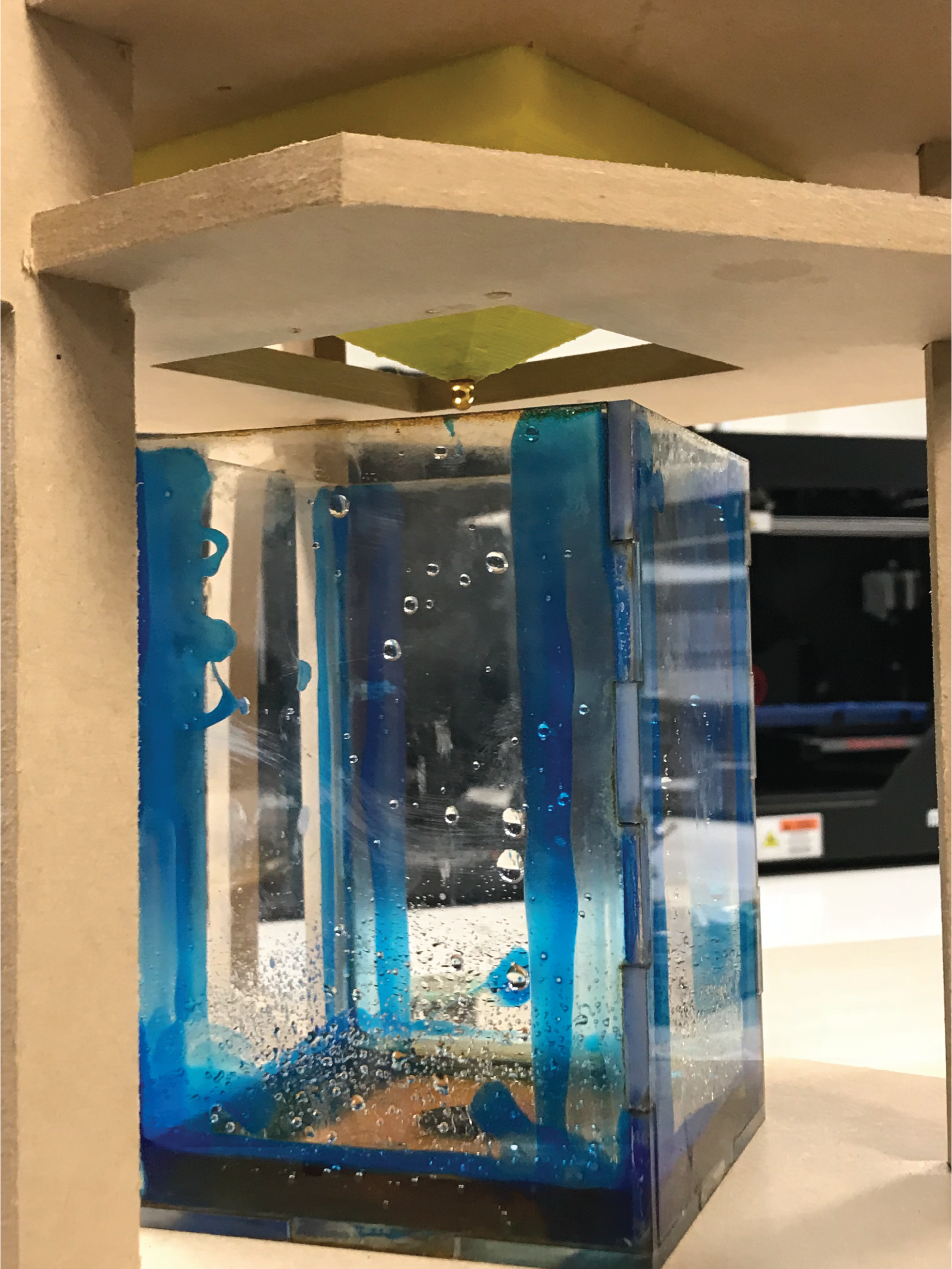 I then assembled the water tanks, using 4 mm-thick plexiglass. I realized that the water might leak through the prees fit joints, so I decided to secure it using fish tank silicone. Unfortunately, I only had blue silicone, and the effect it created is not what I intended. Still, it works against leaks so, I'm happy with the result.