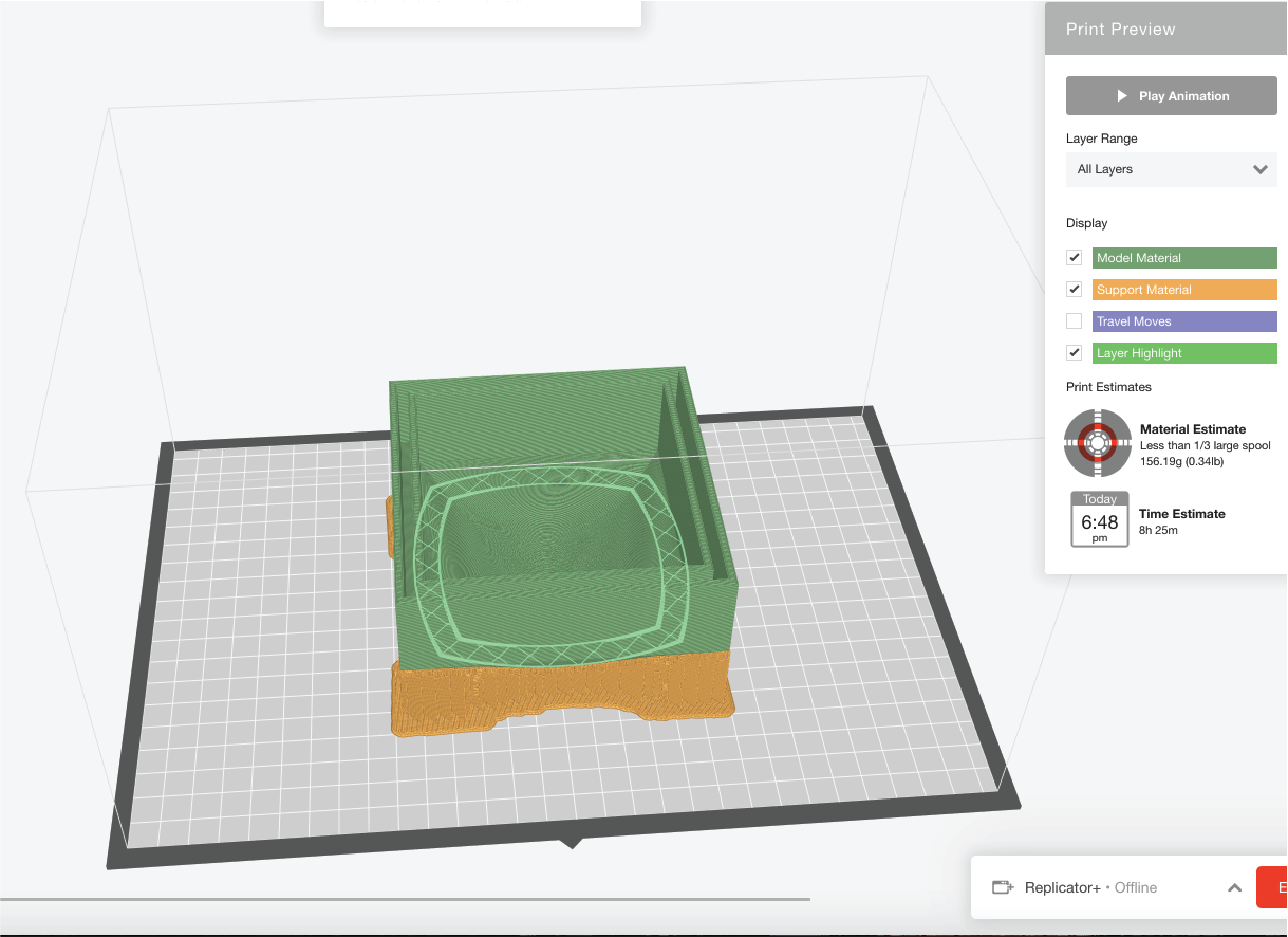 The next step was 3D printing the grips and the funnels I had designed in fusion 360. I gave an extra 0.25 mm as tolerance, because this is wgat we found during 3D printing week. I imported the files into the makerbot printing environment: