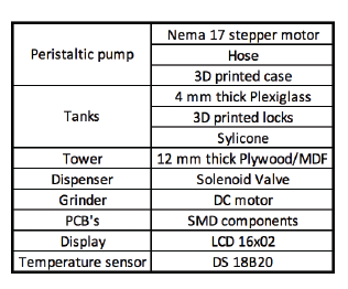 Apart from the actuators, I will be making manufacturing most of the project. I'll use acrylic for the tanks, MDF or Plywood for the Tower, PLA for the peristaltic pump, silicone as an isolating and sealing agent for the tanks, and PCB's.