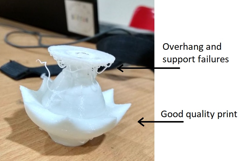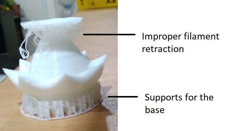 This is the 3D print of the vase . as you can see majority of the print of good quality . Whereas the top part being too thin for the printer is messed up. This could have been resolved by using supports . In this particular setup no supports were generated
