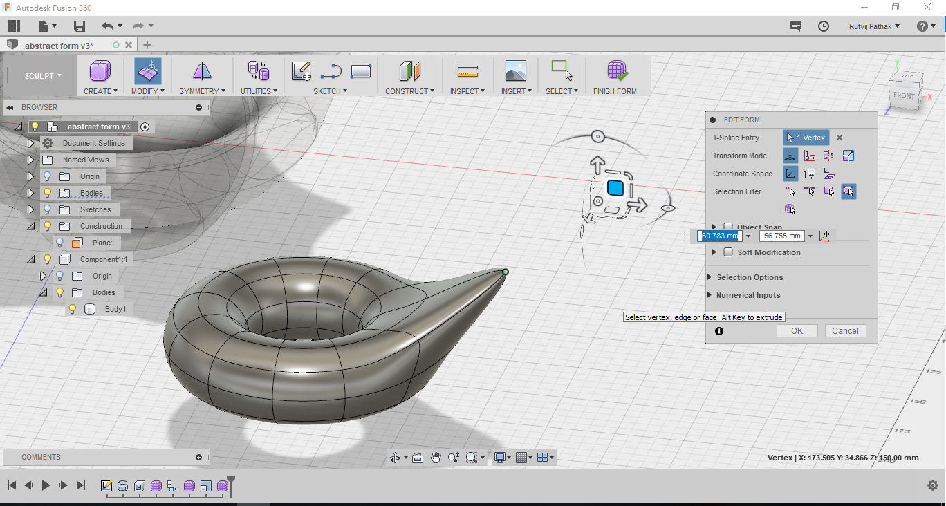 For designing my own print I went into the sculpting environment of Fusion 360 as I thought this would be good opportunity to learn complex surfacing tools in Fusion 360. The “sculpt ” environment . Vase was designed using the plane where a t spline . After it was constructed I used the revolve command . I used the sculpt environment but the body couldnot be edited . The body could not be edited because revolve generates a single surface body. While the sculpt environment generates the same surface but with multiple vertices and rectangles . First i created a toroid , which i manipulated to form a peak . This peak was then isolated i.e i deleted everything else and duplicated circularly in the access. This was used to create the flower shaped pattern .