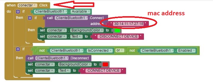 When the button is pressed "Connect" try to connect via bluetooth with the MAC address indicated, if you find the device, the button will change to green, else the connect button will turn red
