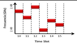 Bluetooth operates in the ISM frequency band of 2.4 GHz using the technique of frequency hopping FHSS which consists in dividing its frequency band into several channels of length of 1Mhz and performing 1600 jumps per second in a pseudo-random way