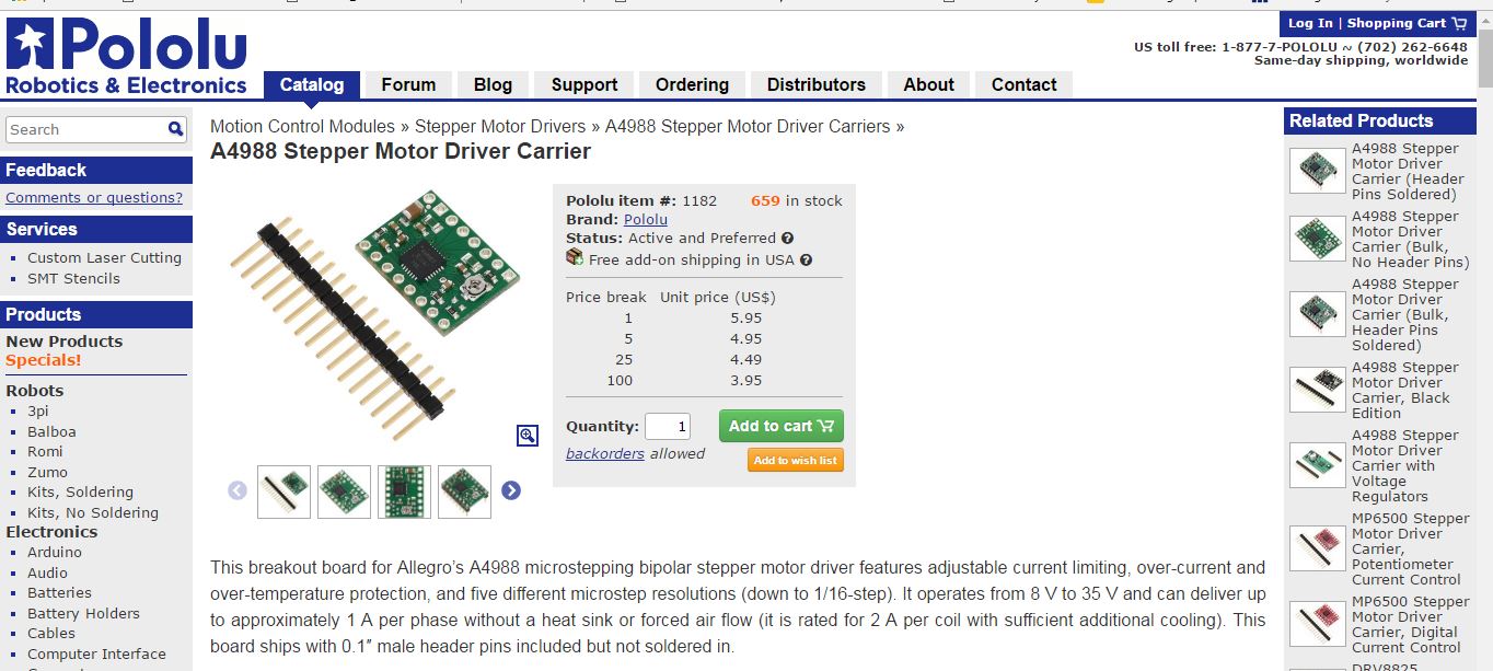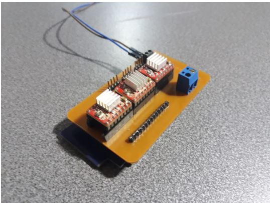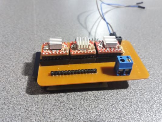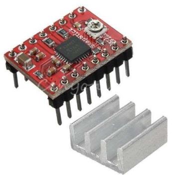 For the circuit I used A4988 that is a bipolar stepper driver circuit that allows you to drive a bipolar stepping motor up to 2A of current from any microcontroller. This driver for stepper motors has a current limiter, and protection from overheating and over consumption to ensure proper operation when you use it in your projects. The driver operates in a range of 8 to 35V with a current of 1A per phase (without a heat sink) and has the capacity to support up to 2A per coil if there is sufficient additional cooling.