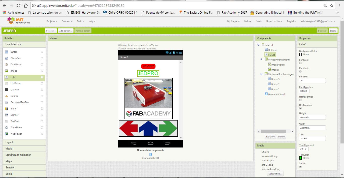 , also use vinyl cutting for decoration, see week 3.For the communication between the programming interface and the robot the bluetooth technology was used, using the modules hc-05, for this a module was configured as a slave and the other as a master, the configuration of the bluetooth modules you can see it in the week 13