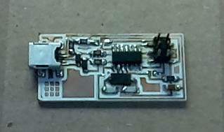 · We built a Fab ISP, “is an in-system programmer for AVR microcontrollers, designed for production within a FabLab. That is, it allows you to program the microcontrollers on other boards you make, using nothing but a USB cable and 6-pin IDC to 6-pin IDC cable. It's based on the USBtiny and V-USB firmwares, which allow the ATtiny44 to perform USB communication in software. Programming can be done through avrdude.”. This board will be useful in the future to program other boards.