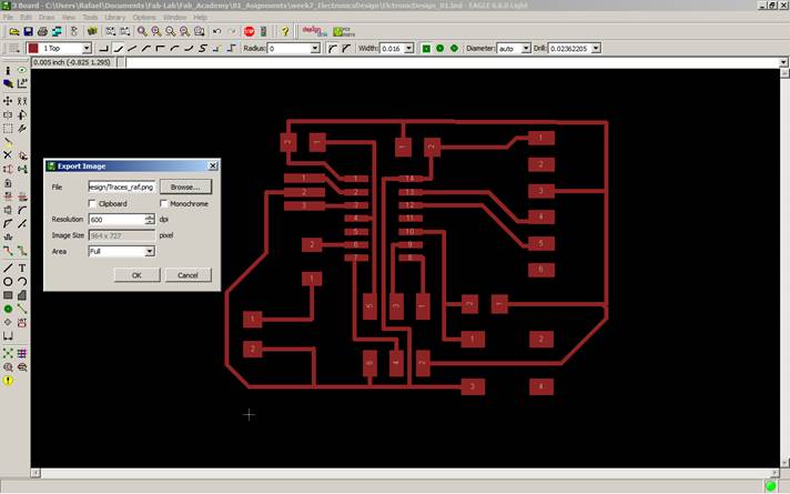 29. In FILE menu go to EXPORT and choose IMAGE. Give it name and location, set resolution to 600 dpi MONOCHROME. DO it separately for the top (traces and pads) and the bottom (outline) layers. You should get this way two PNG files, one for traces and pads milling and second for outline cut out milling.
