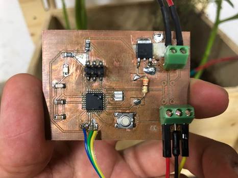 I designed in Eagle a new board for my final project, but also work for this assignment. I tested the one of the components of the device: The Input of the Soil Humidity sensors. Two sensors will be connected to the board, and the board is feed my power source of 5V. The connection is similar that the previous with the FabDuino, but easier because I don´t need the Arduino as Power source.