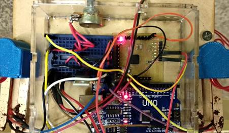 I put pins all around the board to make it easy to connect and disconnect with jumpers. I connected the sensors to the analog pins. Extra, I had to make a breadboard with a mosfet to be able to control the solenoid valve. At the moment of powering the circuit I saw myself in certain difficulties. The solenoid I fed it with a power source that would give 12v. And for the board, I used an Arduino, but only as a current transformer, I connected a 9 volt battery to the Arduino that only fed fabduino with the 5v voltage that it required. I put everything in an acrylic box to protect the circuits and to be visible since the plate turned on and off its LED also depending on the humidity conditions of the soil. This box is placed under a piece to protect it even more, since it would be exposed to the elements. It is already mounted on my final project