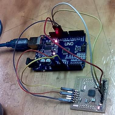 Once the PCB was cut, I proceeded to weld its components. In the Lab there was no AtMega, so I recycled one from a damaged Arduino. I learned the technique of unsoldering and welding with a heat gun. It should be placed at 500 ° C and left very close to the arduino so that the tin loosens and the plate is released, taking it with a clamp. Then the microprocessor is placed on the PCB that I cut and as it brings tin still attached to its legs, when placing the gun again very close, the tin adheres to the traces. (Previously it is necessary to place solder paste on the plate to help the adherence of the tin to the traces)