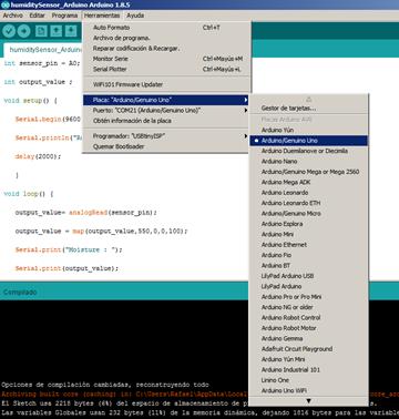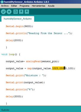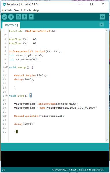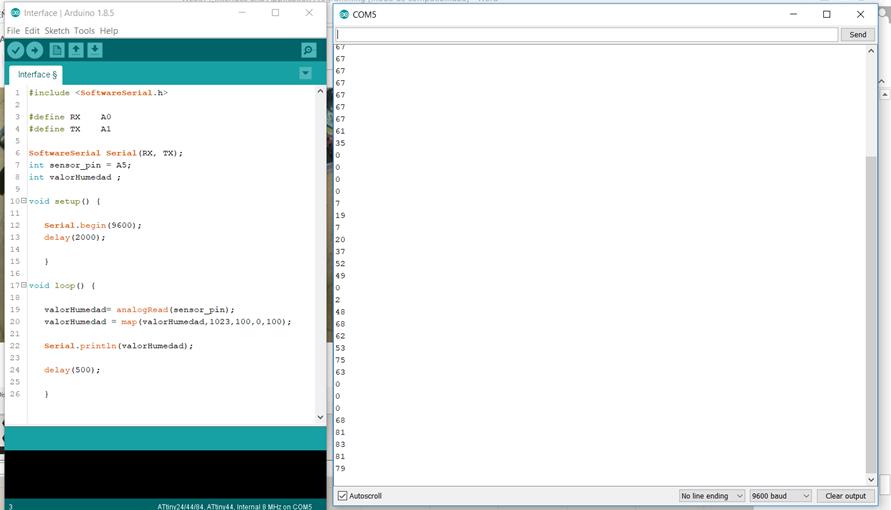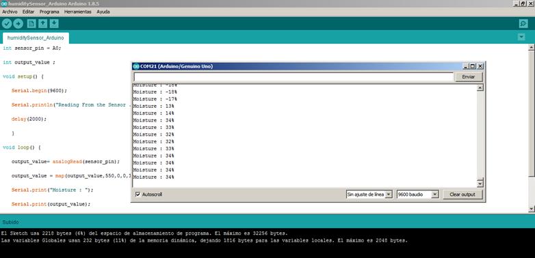 · The Arduino monitor is also a basic interface that comes with the Arduino program. Allows you to print and list a series of value you define in this case by a sensor and transformed into a comprehensive range from o to 100%
