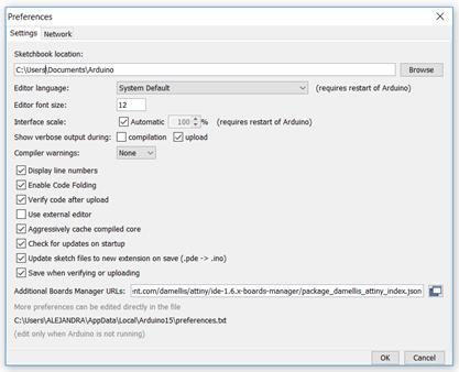 1. I used the board I did for the Electronic Design Assignment. First, I had to Burn the Bootloader to be able to program my ATtiny, but I didn’t have the board installed and it wasn’t available in the Board Manager. Therefore I had to go to the Arduino Forum and find the solution. To solve this I had to go to File / Preferences / Additional Boards Manager and paste the following URL: https://raw.githubusercontent.com/damellis/attiny/ide-1.6.x-boards-manager/package_damellis_attiny_index.json