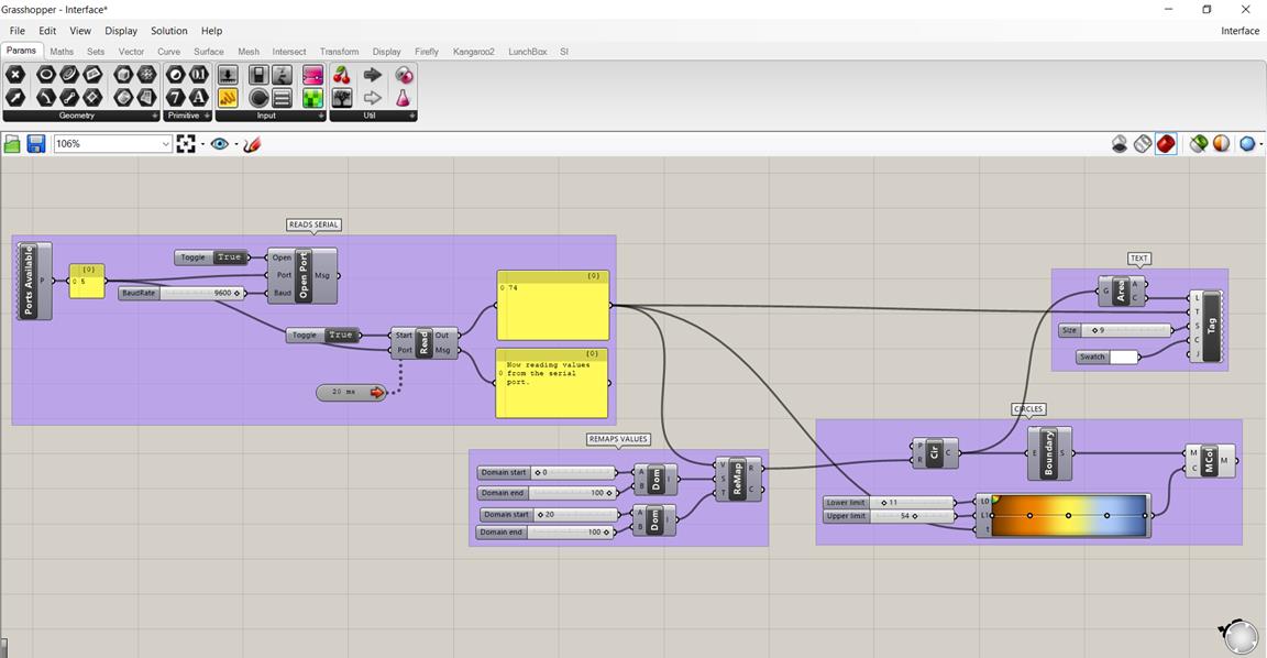 3. Once I was reading values from my board, I could do the interface. I decided to use Firefly (https://www.food4rhino.com/app/firefly), a plugin that communicates micro-controllers to Grasshopper, so that I could have a graphic visualization of my data.