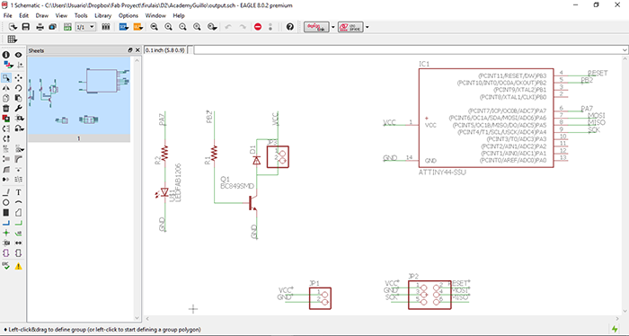 To carry out the design of this board, in the Eagle software we put all the aforementioned components in order to generate