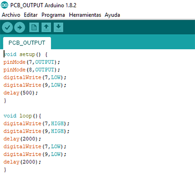 In the VOID SETUP we declare pins 7 and 8 as outputs, as well as the same pins we declare that they start off, followed by a DELAY of 500 milliseconds this in order to stabilize the board when energizing it.