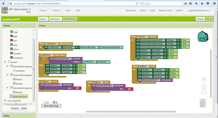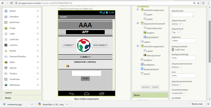 within the interface development we modify the graphic environment. Inventor App handles an intuitive and easy to learn environment in which we only drag the tools either to program as we can see in the previous image or as to design the graphic environment as we see in the following image.