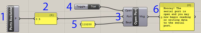 First, select the tool of valid port "Ports available" + "Panel" tool you check your information and them you select "Open port" and add the values of the ports, in the open you connect "Boolean toggle" change "true" or "false" to connect or disconnect the serial port next in port you connect the "Panel" of the last communication and the "Baud" check the number of connection in the code.