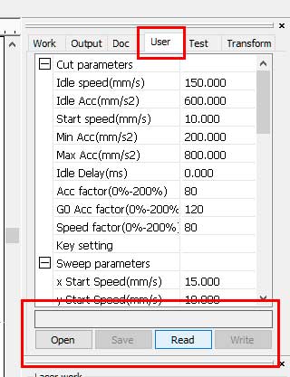 To send the file to the machine in the right window we have the USER button, we click on the READ button with which the software is linked to the machine. We send the configurations from the computer to the machine.