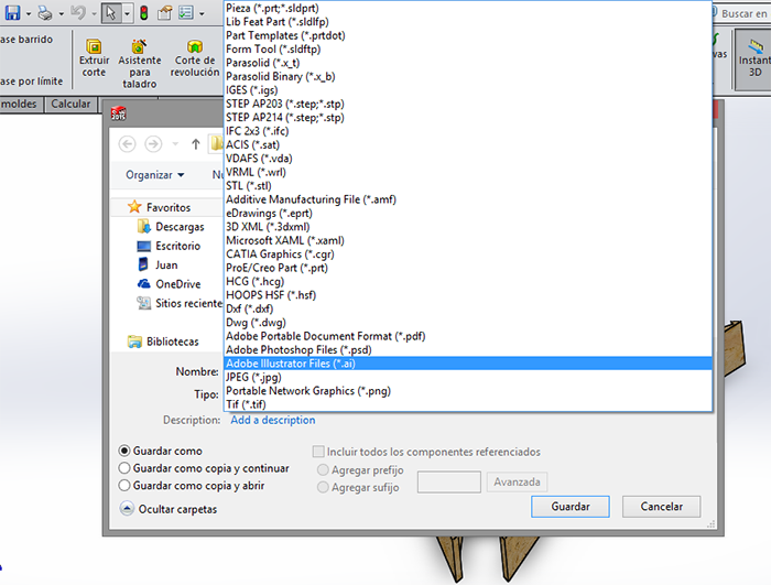 Within Solidworks export processes, it allows us to send our file to various formats for the different processes that we might need. For this process we export the files in a bidimentional format (AI) which was opened in Illustrator to be able to attach the pieces in the cutting bed.