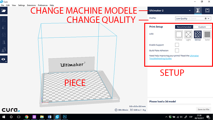 To print on this machine, the CURA software used in which we calibrate the print parameters as shown in the first image and in the following; the print process can be seen.