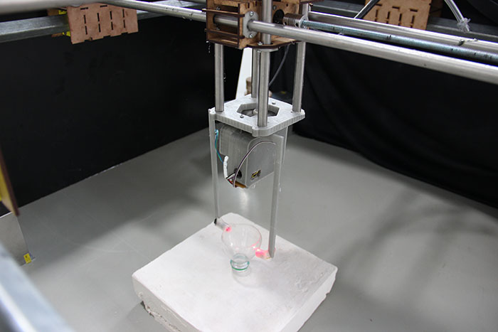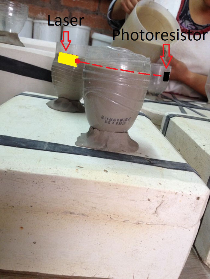 on the laser and the photoresistor receive the light, when the photoresistor receiving the laser light means that the mold still needs more liquid until the fluid cuts off the signal,