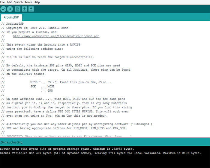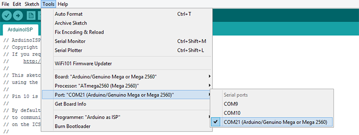 Arduino mega is upload the example ArduinoISP, for the correct compiling make sure that in the tools correct Arduino and select the correct port, remember not edit the example
